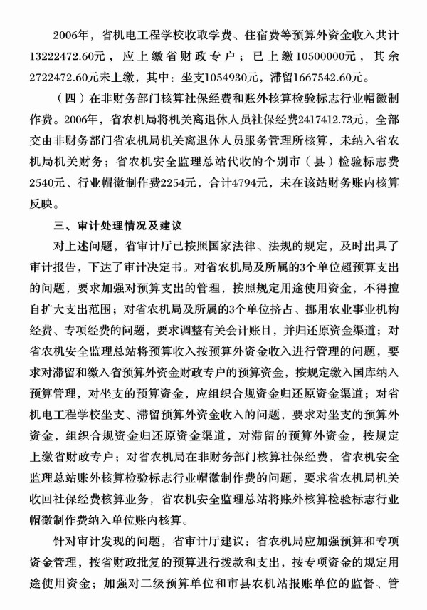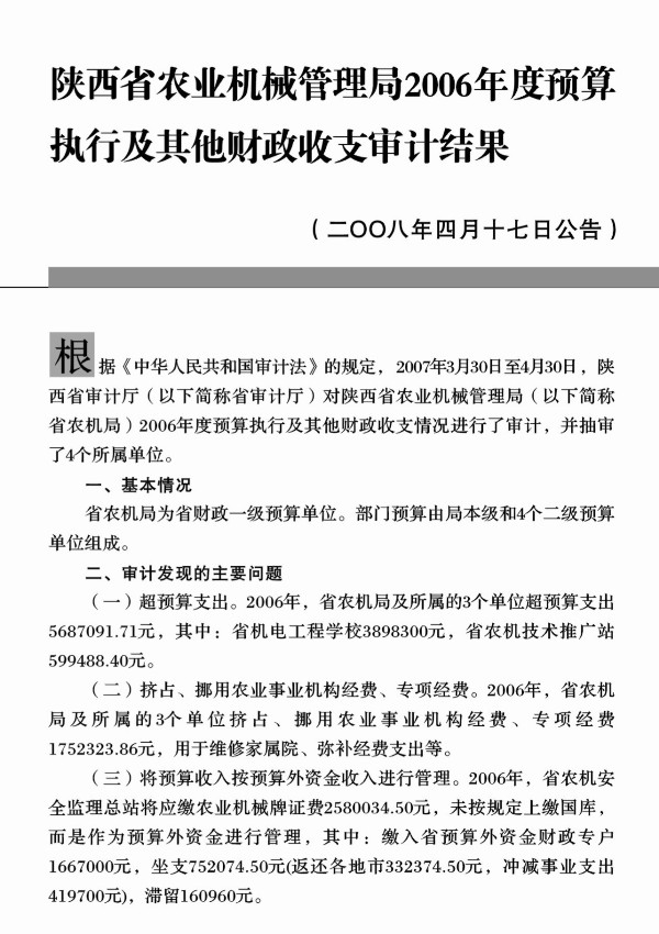 2008年第2号:省农机管理局2006年度预算执行及其他财政收支审计结果