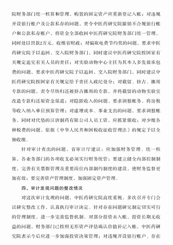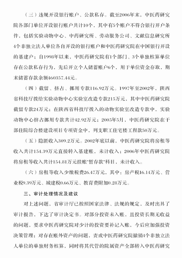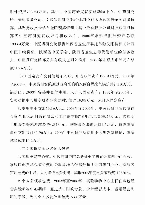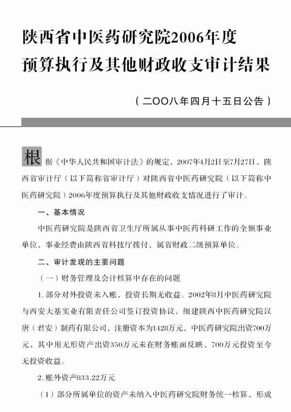 2008年第4号:省中医药研究院2006年度预算执行及其他财政收支审计结果