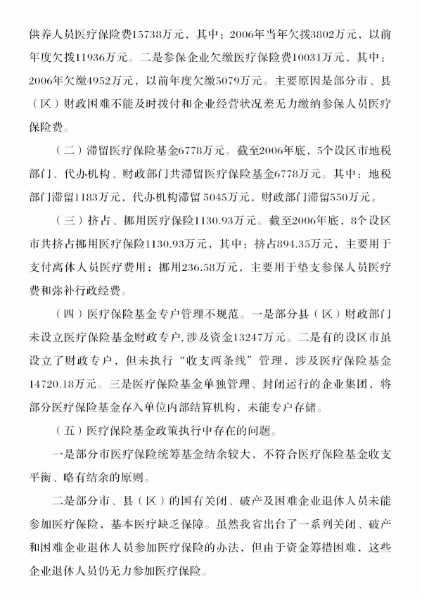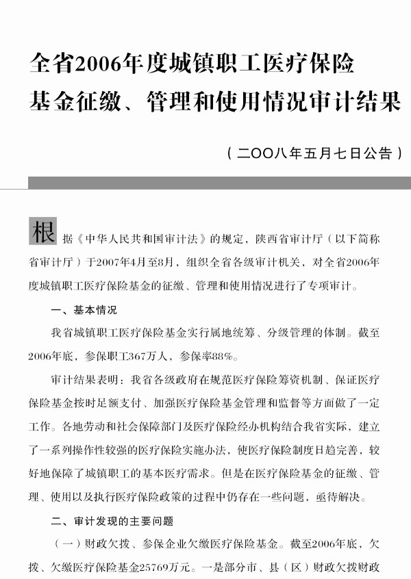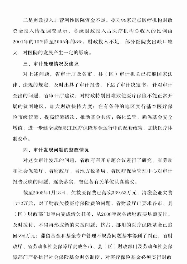 2008年第7号:全省2006年度城镇职工医疗保险基金征缴管理和使用情况审计结果