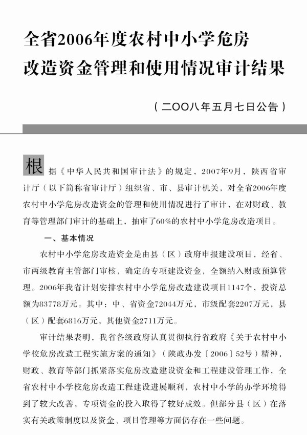 2008年第8号:全省2006年度农村中小学危房改造专项资金审计结果