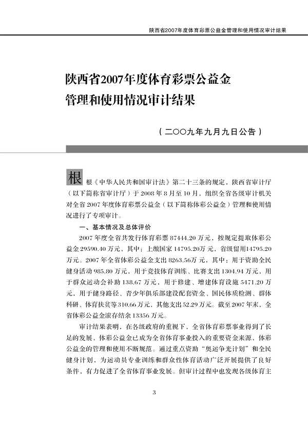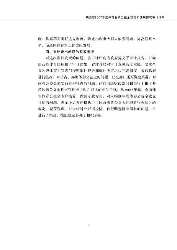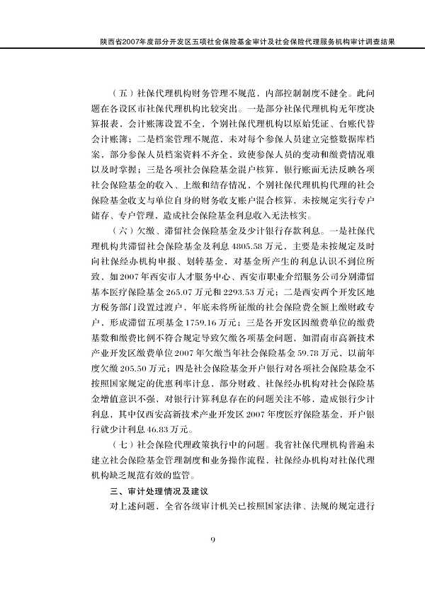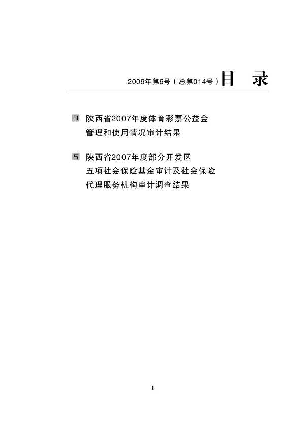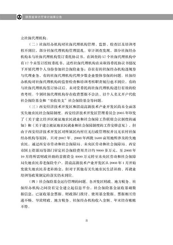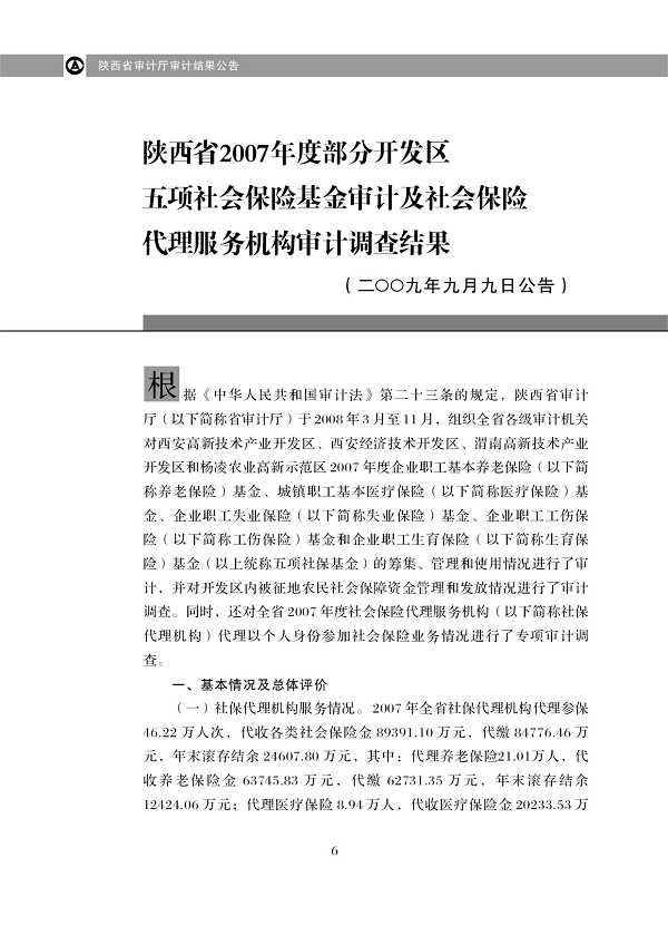 2009年第6号: 陕西省2007年度体育彩票公益金管理和使用情况、部分开发区五项社会保险基金审计及社会保险代理服务机构审计调查结果