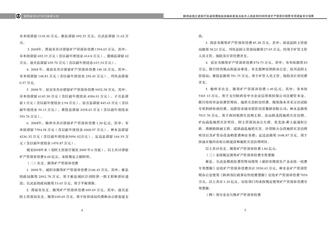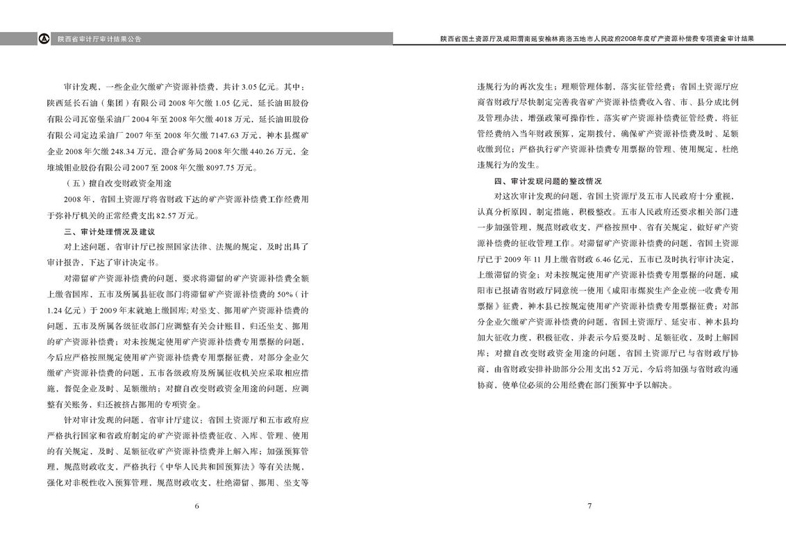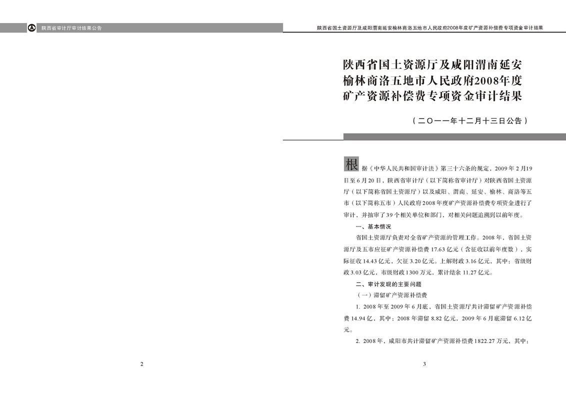陕西省国土资源厅及咸阳渭南延安榆林商洛五地市人民政府2008年度矿产资源补偿费专项资金审计结果