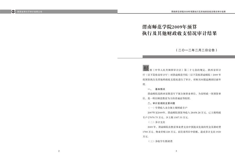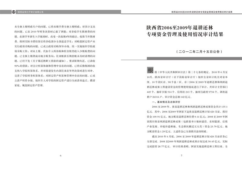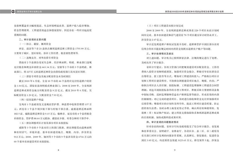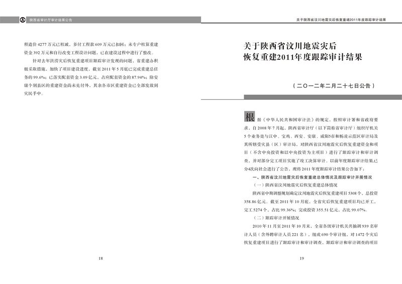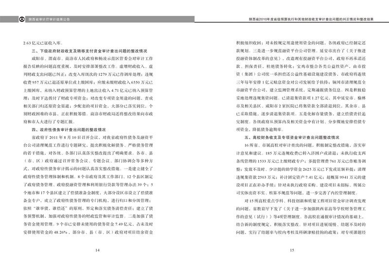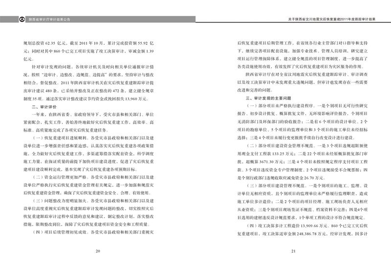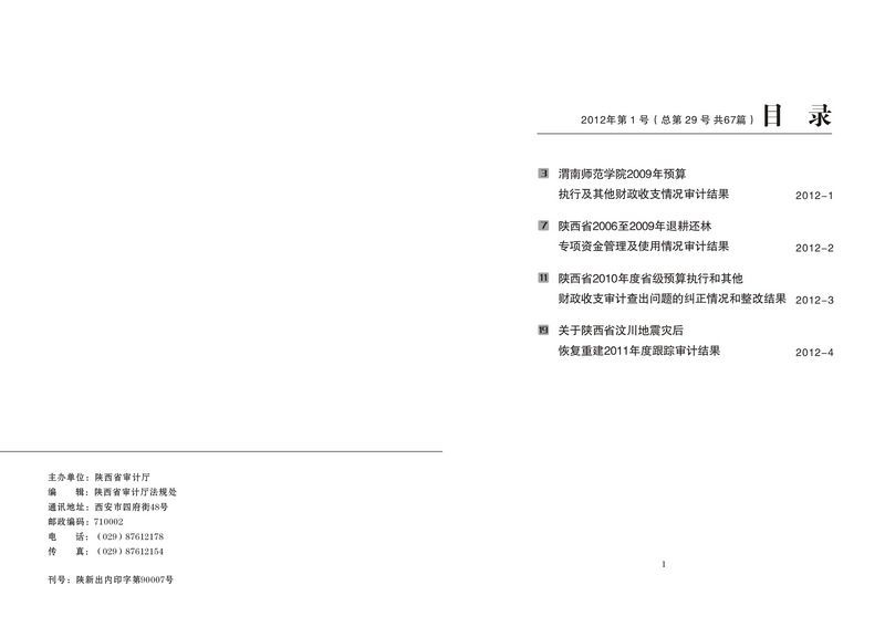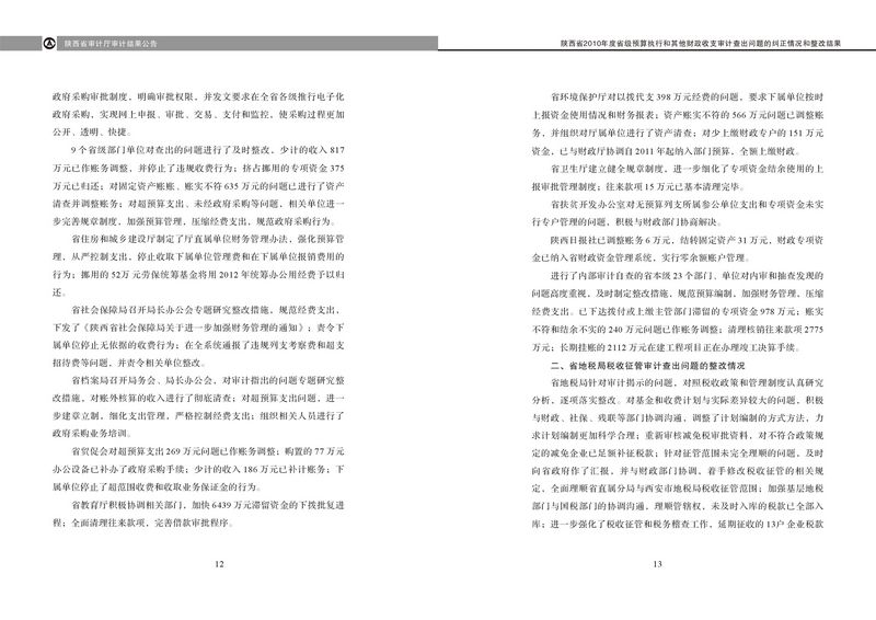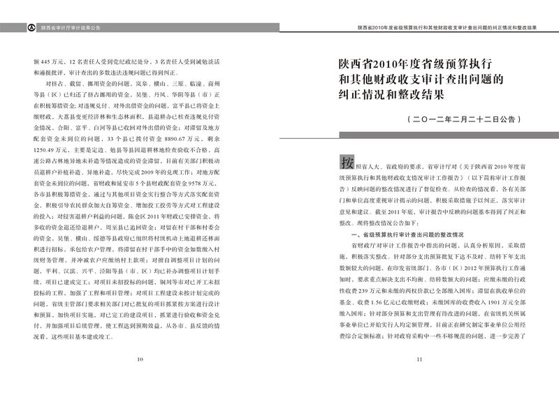 2012年第1号公告:陕西省2010年度省级预算执行和其他财政收支审计查出问题的纠正情况和整改及陕西省汶川地震灾后恢复重建2011年度跟踪审计等审计结果公告