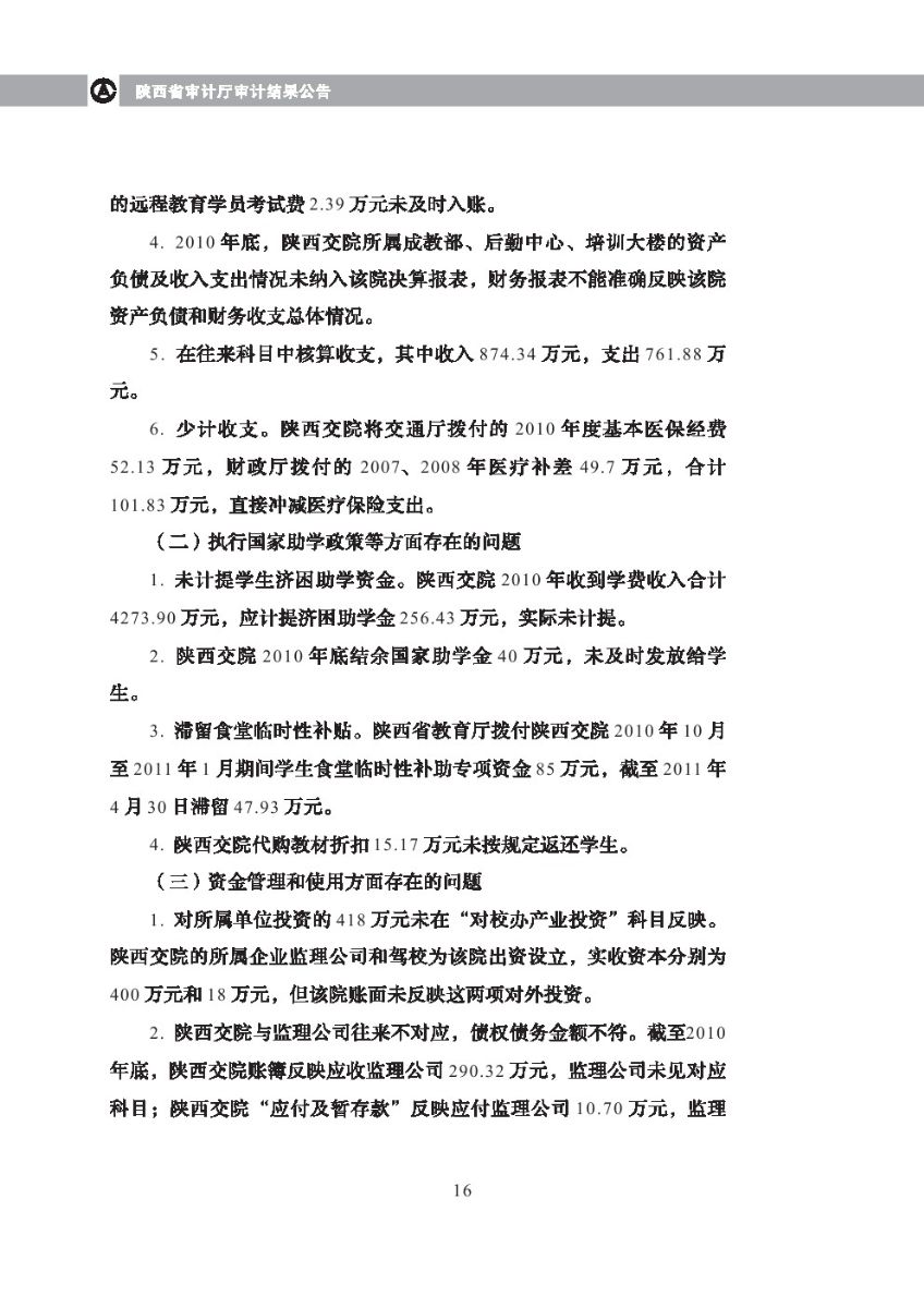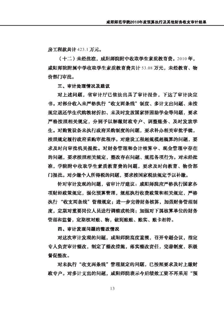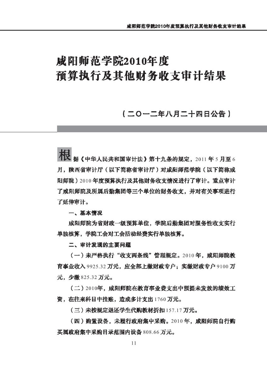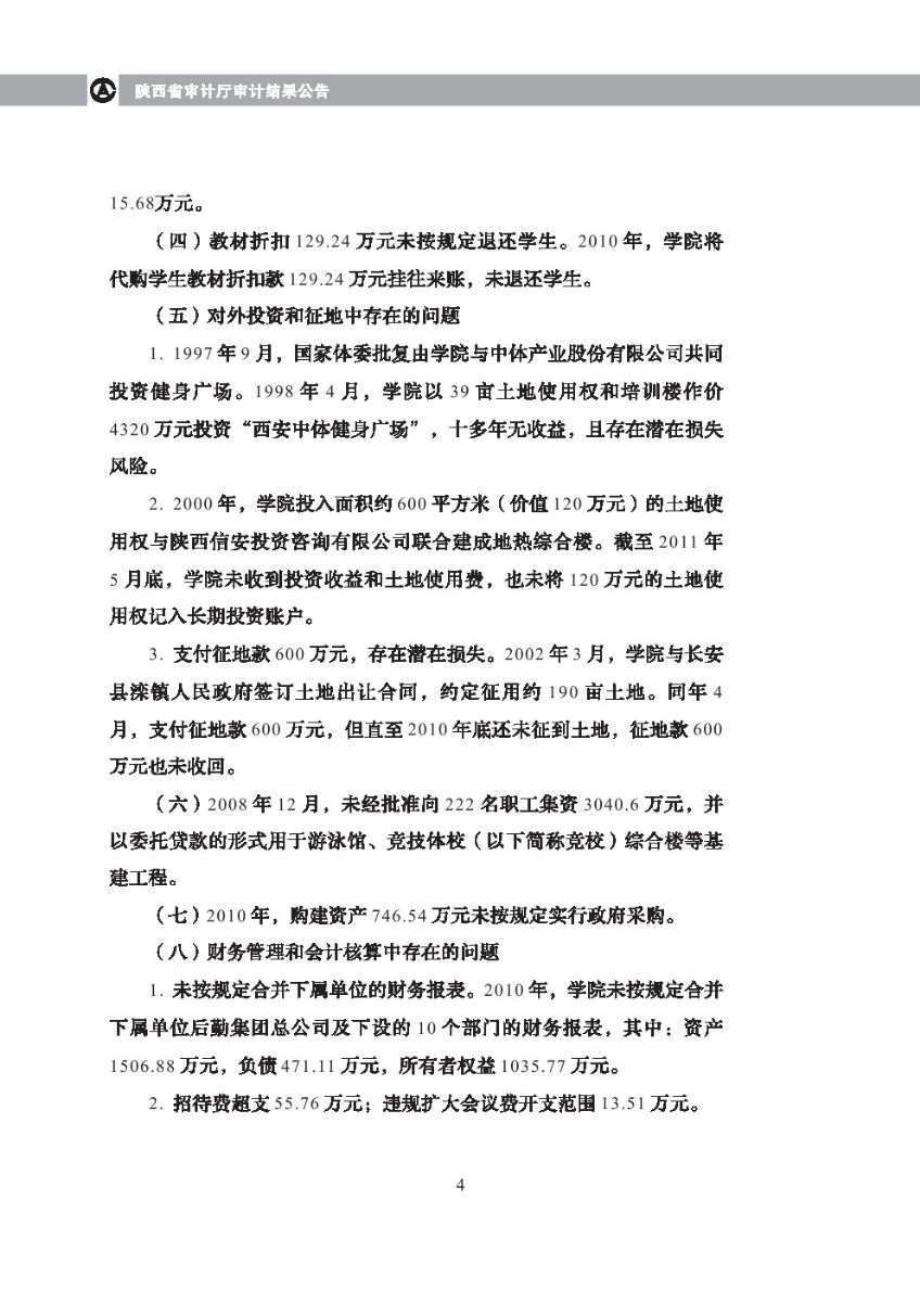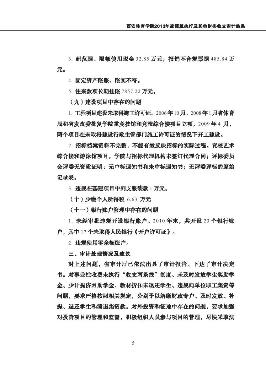 西安体育学院2010年度预算执行及其他财务收支审计结果等