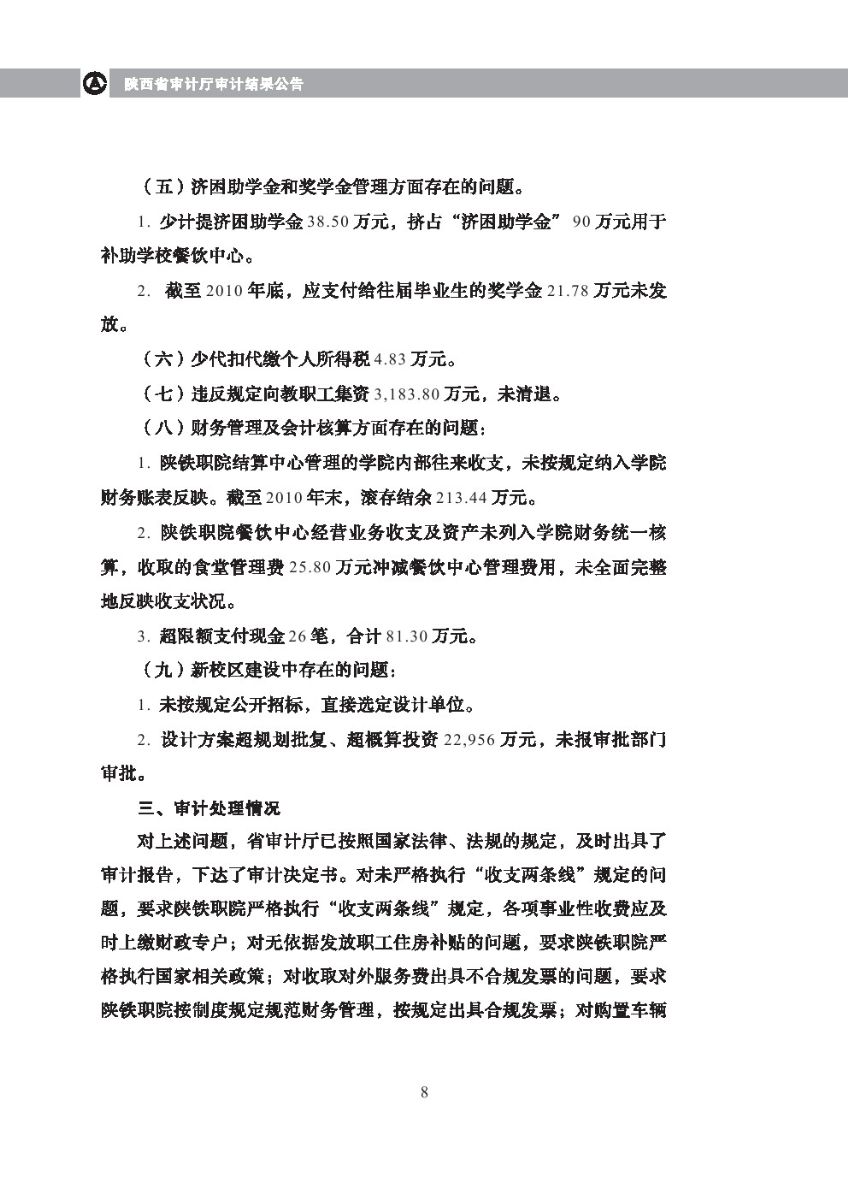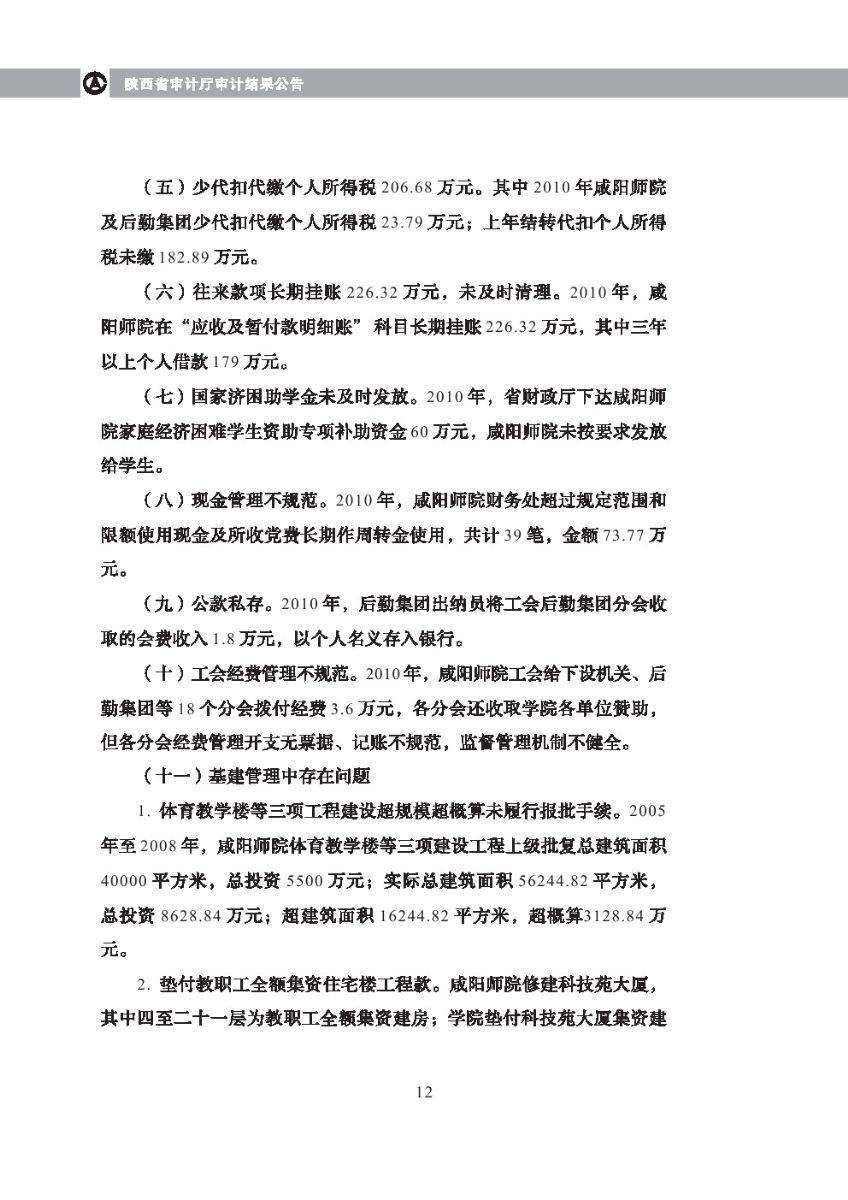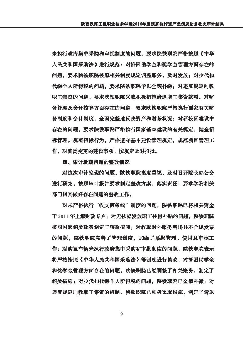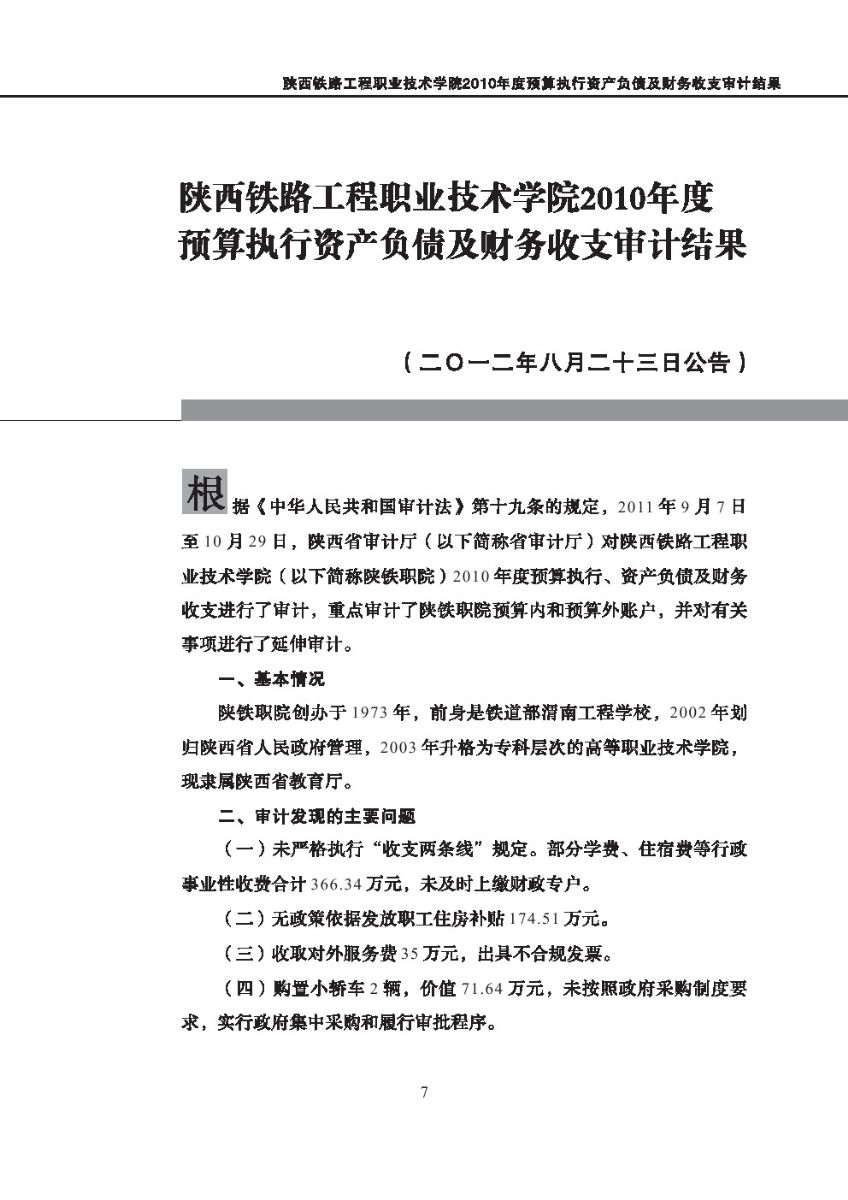 西安体育学院2010年度预算执行及其他财务收支审计结果等