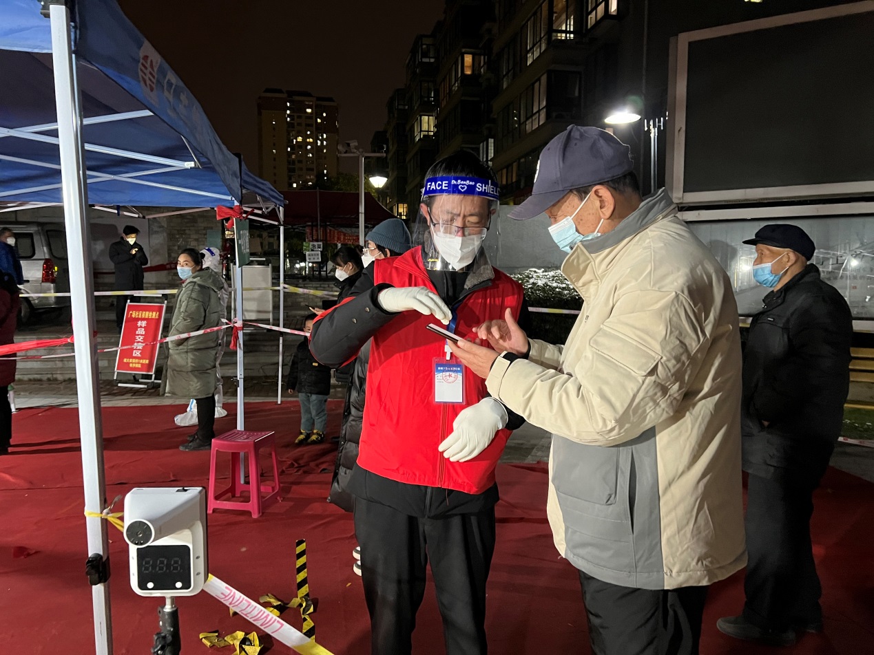 夜深了,下沉干部还在小区坚持维持核酸检测采样点的秩序、为老人指导手机二维码扫描